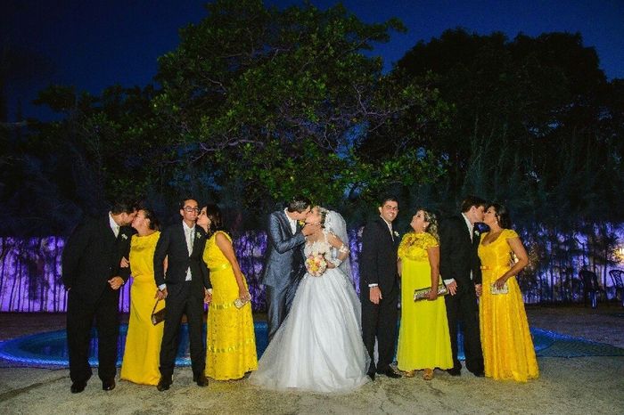 Minhas madrinhas usaram vestido amarelo e os padrinhos ternos pretos com uma gravata q dei em tom champanhe. Não gosto de gravatas amarelas, por isso fiz dessa maneira. E como amarelo demais dói a vista, usei branco na decoração da cerimônia e na...