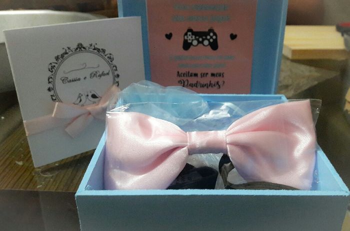 Fiz algo BEM simples, e vim mostrar o resultado pra vocês. Na caixinha, eu coloquei o manual dos padrinhos, palha italiana e a gravata.