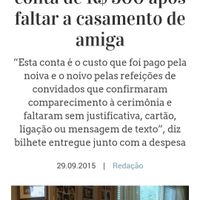 Há 3860 diasOlha essa notícia que acabei de ler, fiquei chocada. Será que essa moda vai pegar ? Achei super deselegante por parte dos noivos cobrar o buffet de quem nao...
