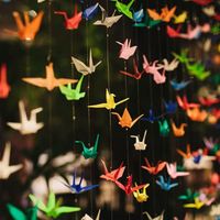 cortina de origami coloridos na entrada da recepção